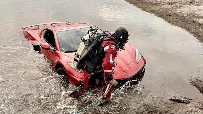 Orlando and Orange County firefighters looked into a Corvette that was found partially submerged in what appears to be a retention pond.